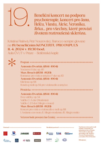 19. ročník benefičního Koncertu pro IMPULS na podporu psychoterapie pro pacienty s roztroušenou sklerózou opět organizovala první dáma české violy Kristina Fialová. Spolu s Petrem Nouzovským a Barocco sempre giovane připravili jedinečný program, který potěšil duši a zahřál u srdce.