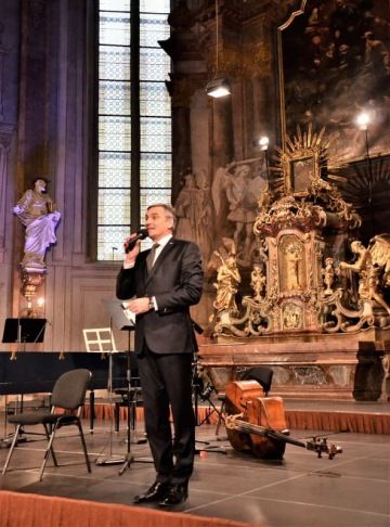 Večerem lehce a svižně provedl herec Jan Čenský, který svými milými slovy dokonale dotvořil dechberoucí atmosféru koncertního vystoupení. Přítomní v sále s ním zavzpomínali na letošní Maraton s roztroušenou sklerózou anebo se zaposlouchali do povídky o dražbě houslí. Moderátor rovněž všechny posluchače pozval na výtečné pirohy Kateřiny Bémové a další občerstvení, které připravil tým Nadačního fondu IMPULS.