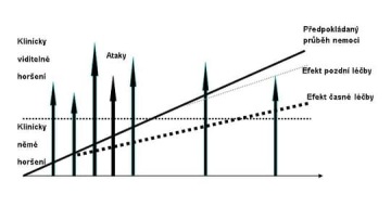 Čím dříve se o zastavení zánětu pokusíme, tím lépe, protože samozřejmě na počátku nemoci je nervový systém v nejlepším stavu a máme tedy největší šanci mu pomoci (viz obr. 2). To je odpověď na otázku, proč je dnes maximální snaha diagnostikovat a léčit nemoc včas a proč ji u většiny pacientů musíme léčit trvale. Našimi léky totiž ještě neumíme odstranit příčinu, pouze řešíme následek, tedy chybnou a nadměrnou činnost imunitního systému a to bohužel musíme dělat celý život (Horáková 2008).