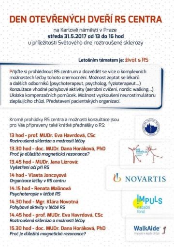 NFI společně s MS Rehab a Všeobecnou fakultní nemocnicí zvou 31. května 2017 mezi 13. – 16. hodinou na Den otevřených dveří na MSC na Karlově náměstí. Zájemci si budou moci prohlédnout prostory RS centra, budou mít možnost konzultací s lékaři a dalšími odborníky a budou si moci také vyzkoušet neurostimulátor nebo mobilní aplikaci pomáhající pacientům s RS. Součástí odpoledne je rovněž několik přednášek.